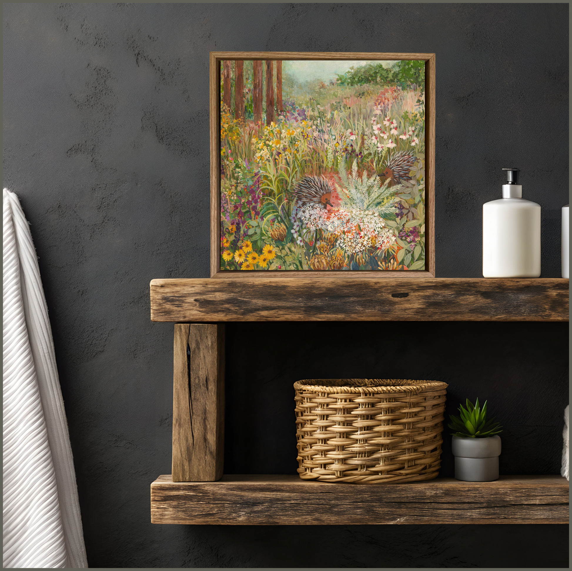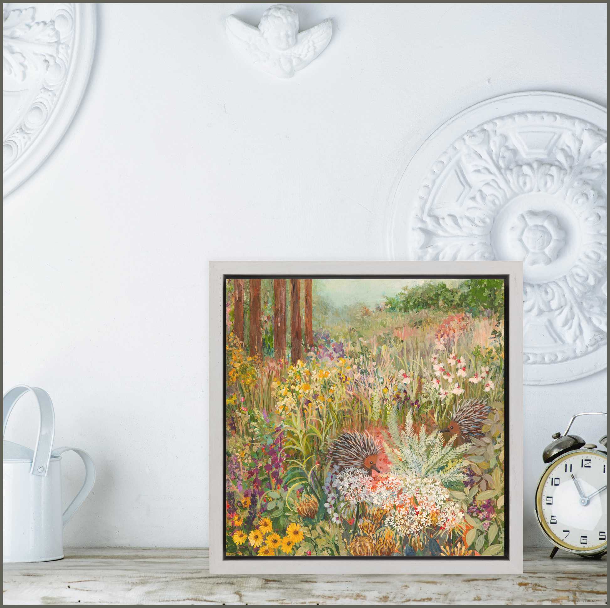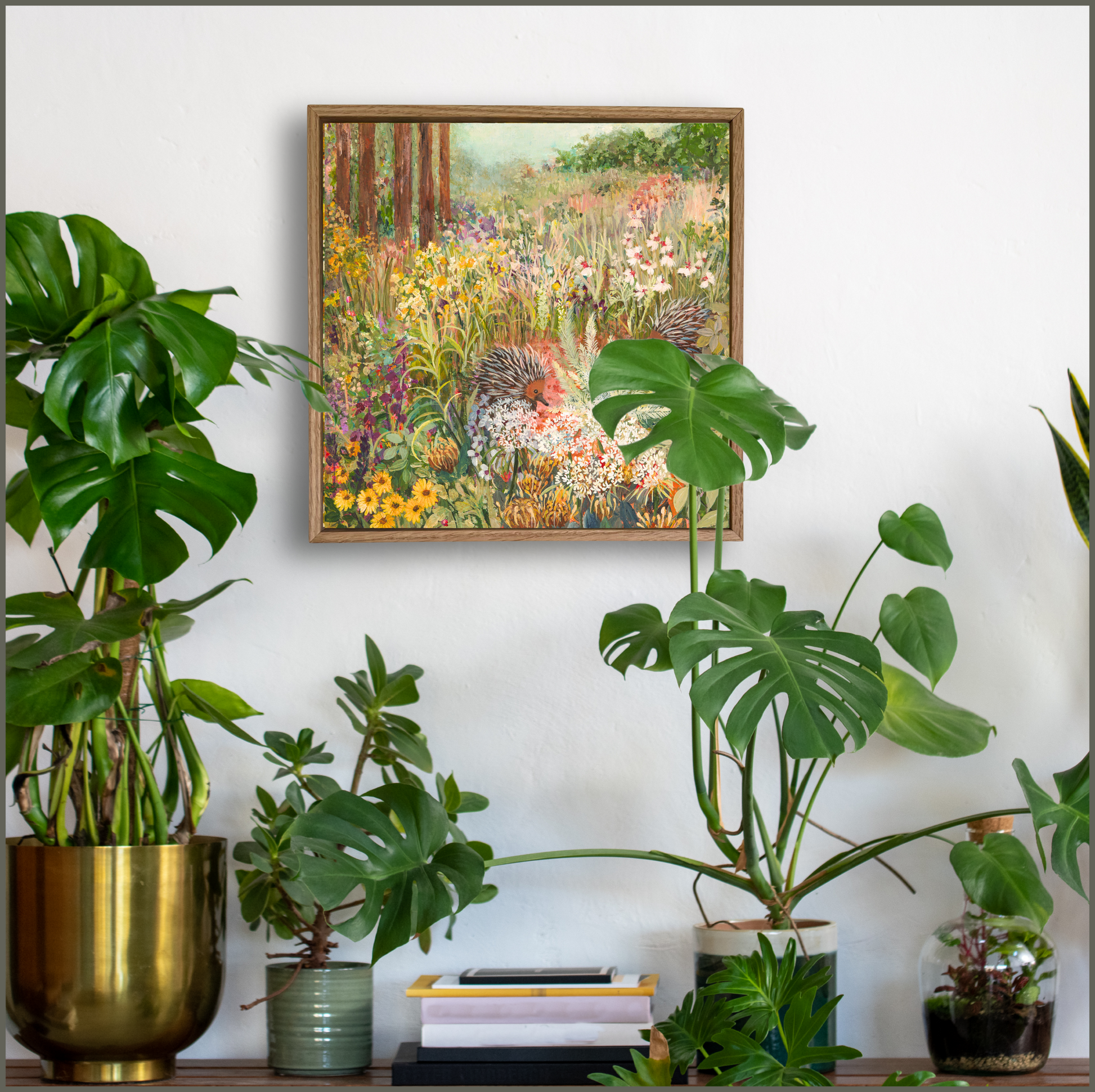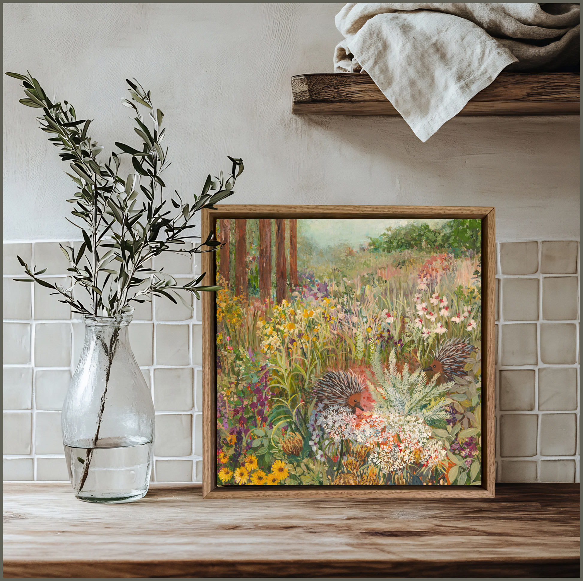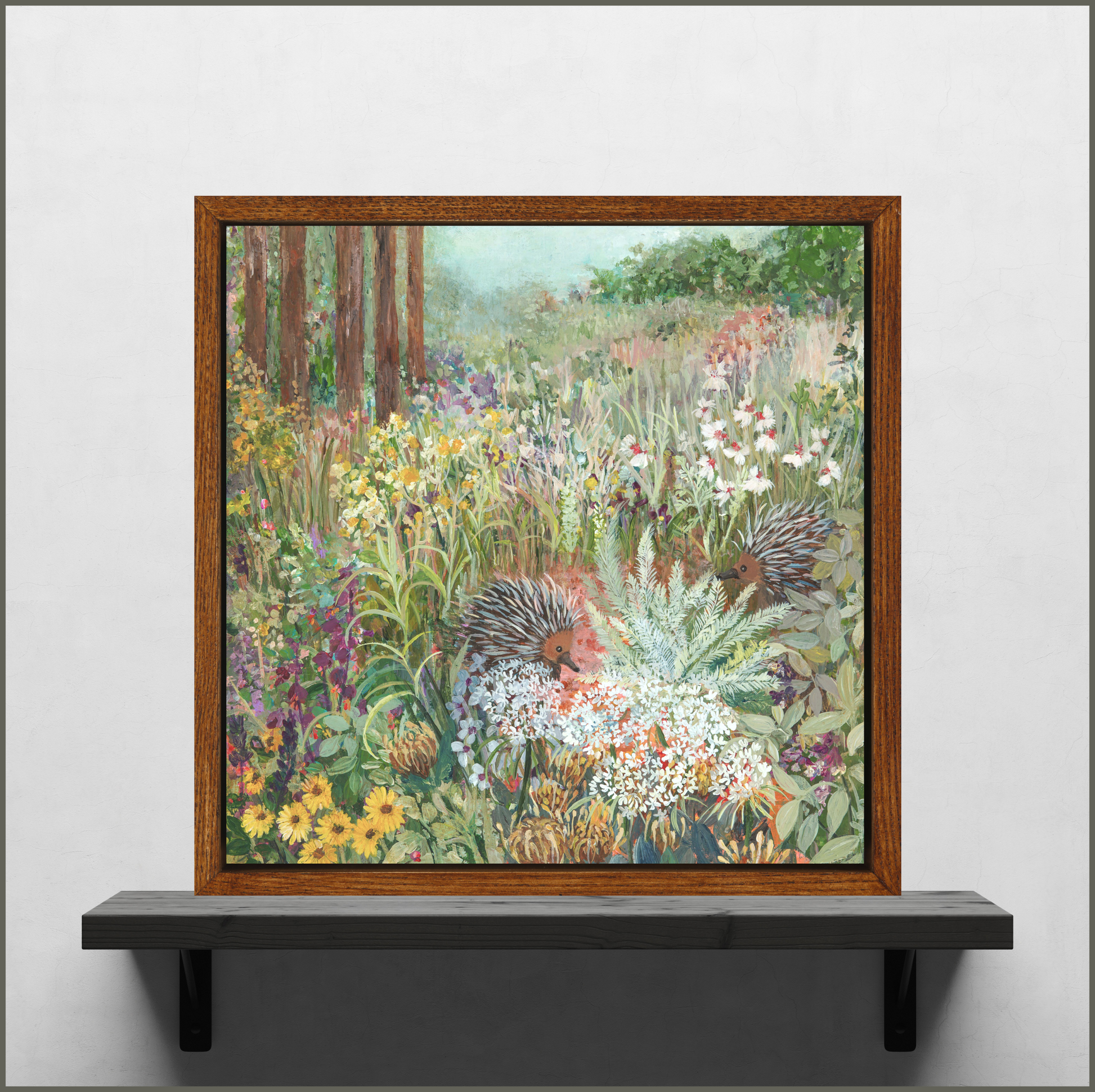 色とりどりのワイルドフラワーに囲まれた、愛らしい2匹のハリモグラ。オーストラリアの豊かな自然と生命の輝きを表現しています。見るたびに心が温かくなるような安らぎと喜びを届けたいという願いを込めました。