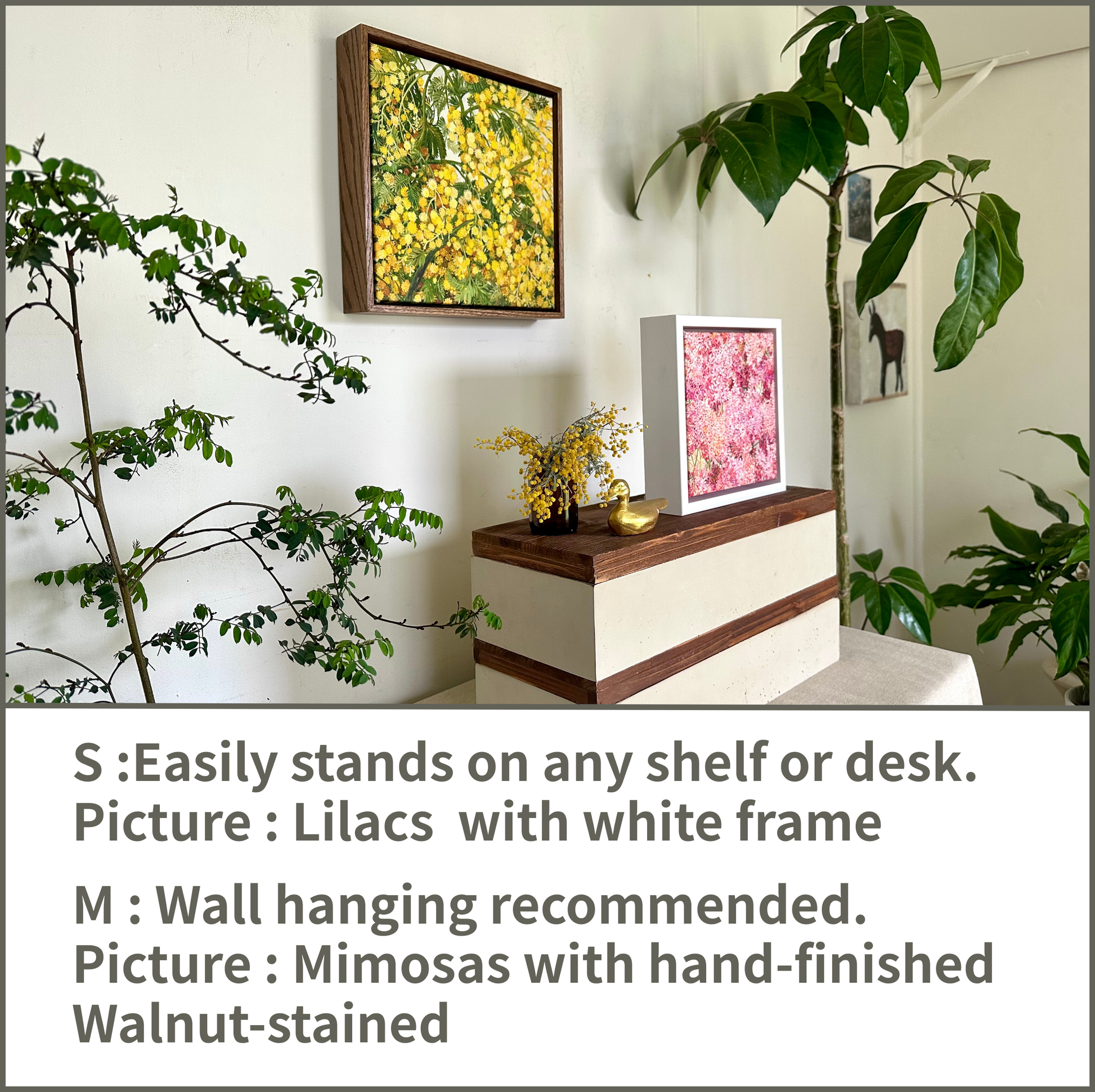 安定感のあるSサイズ(20x20cm)は棚などに置いて飾るのに最適です。Mサイズ(30x30cm)は壁にフックを使いしっかりと固定して飾ることをおすすめします。