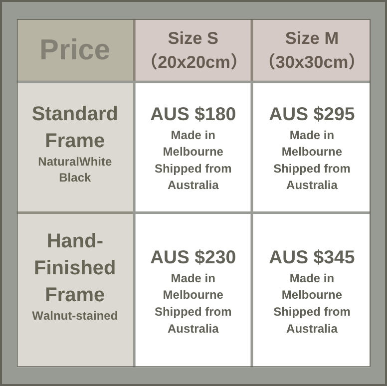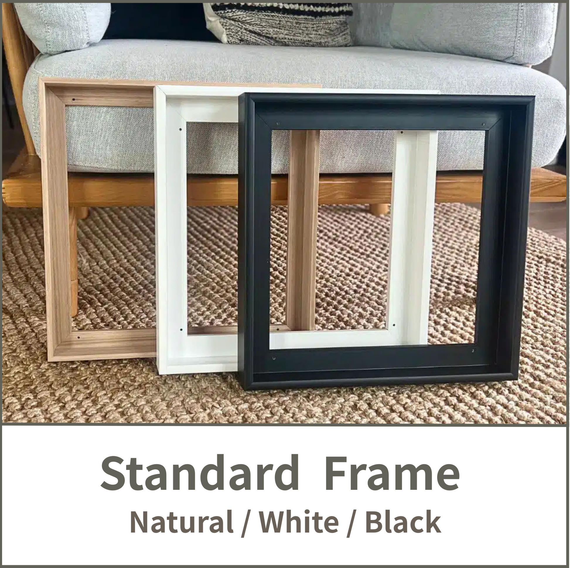 フレーム: オーストラリア産木材4色(ホワイト / ブラック / ナチュラル / 特注ダークブラウン ※追加料金あり)から選択いただけます。