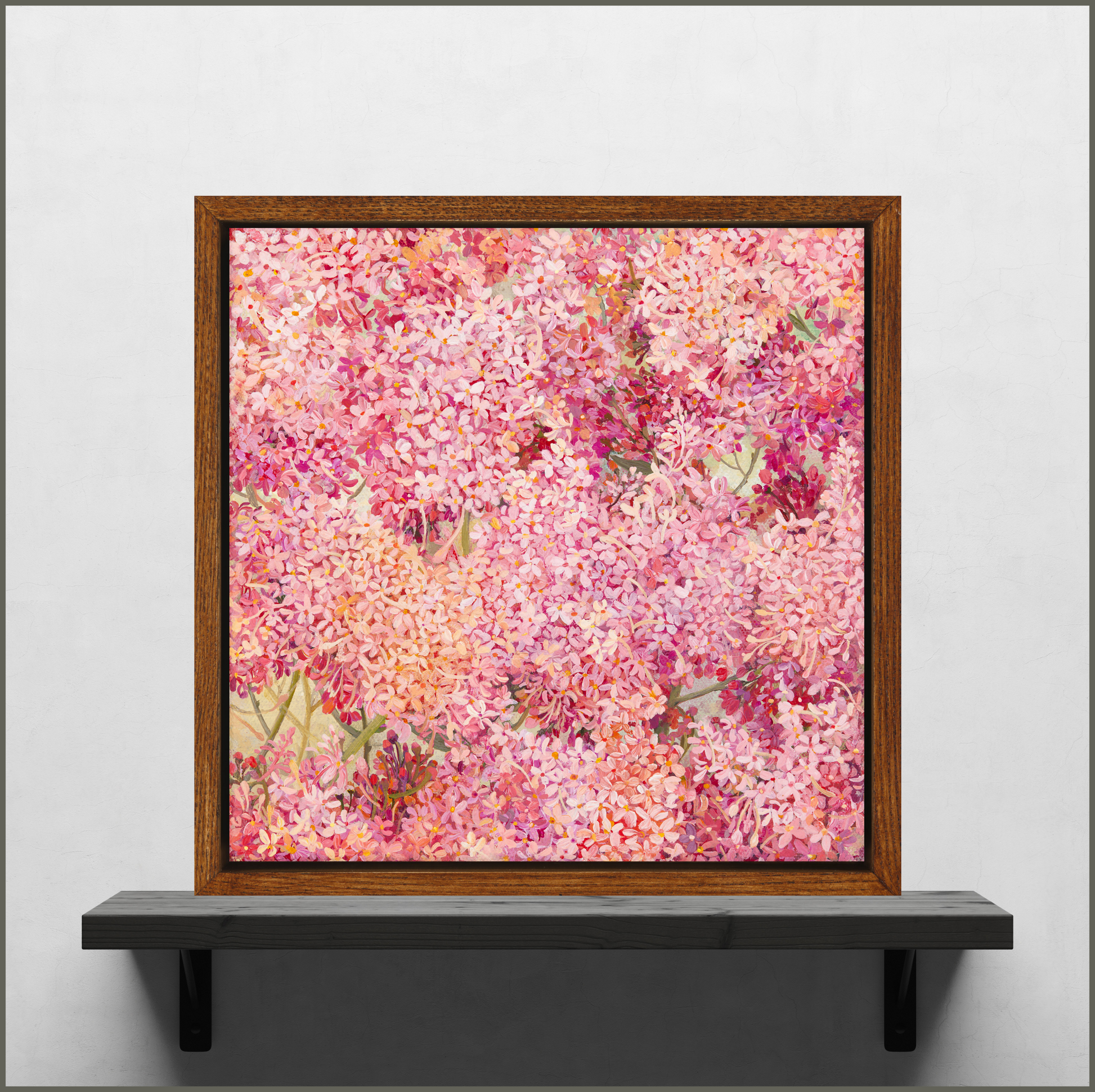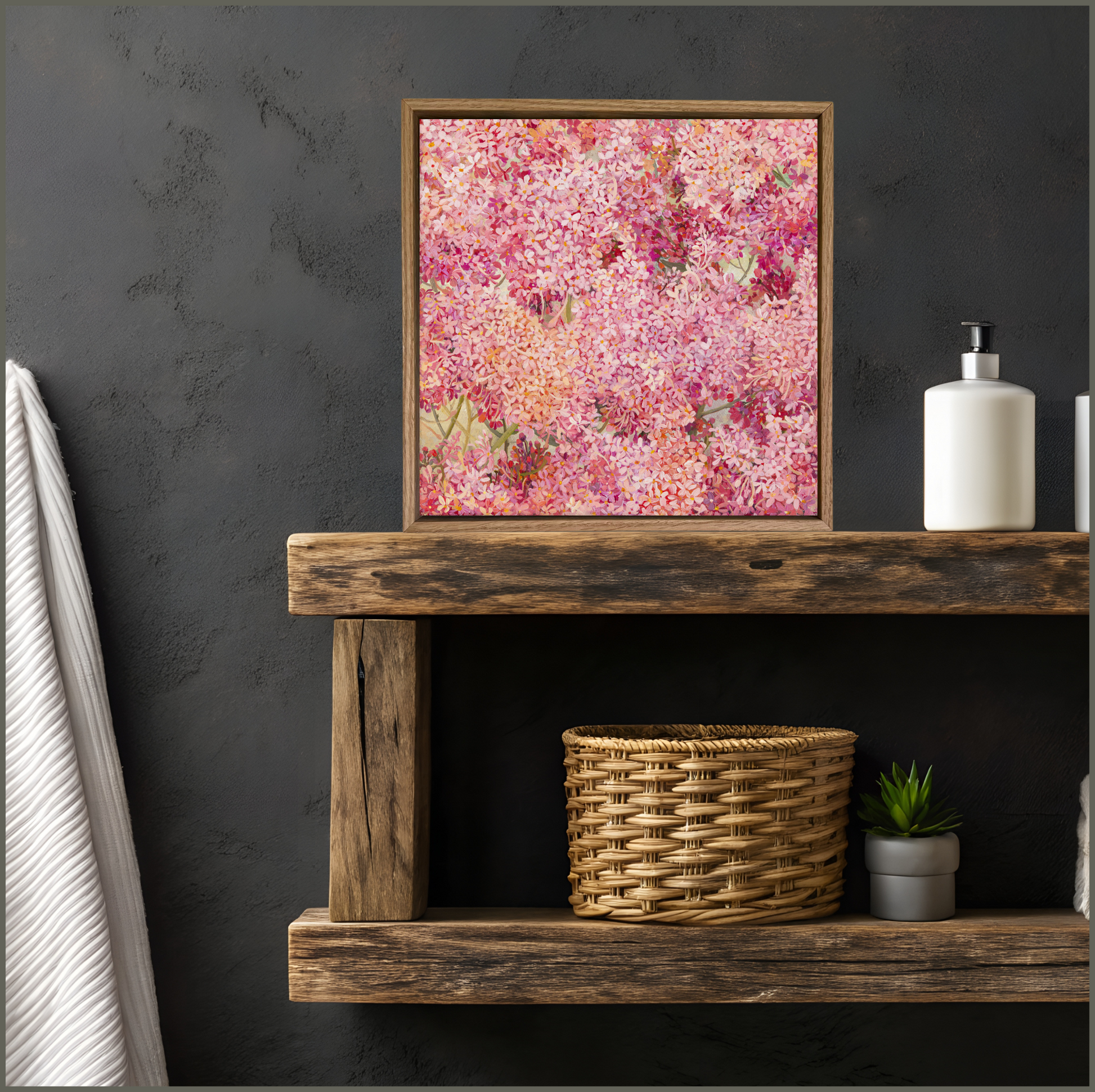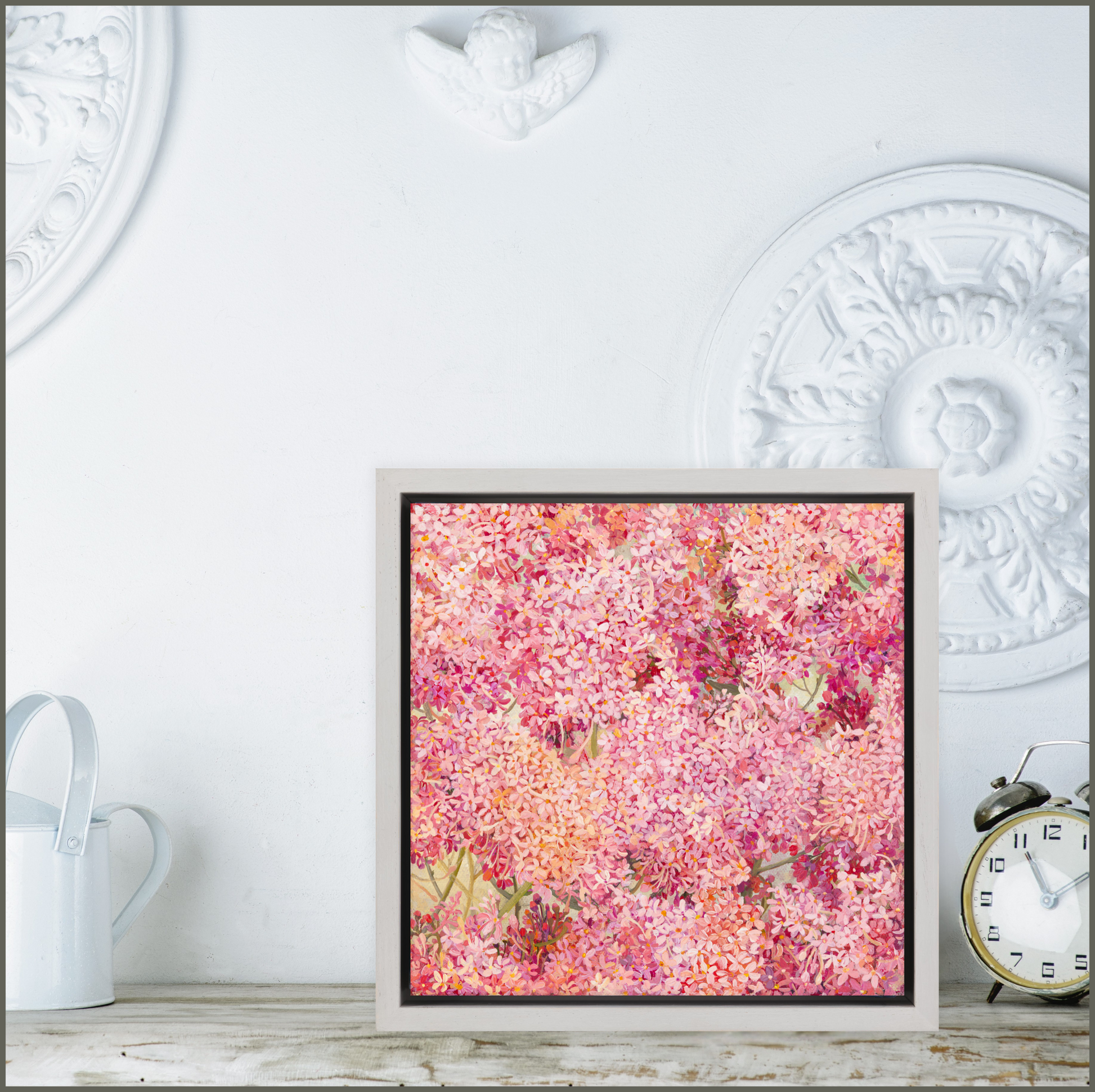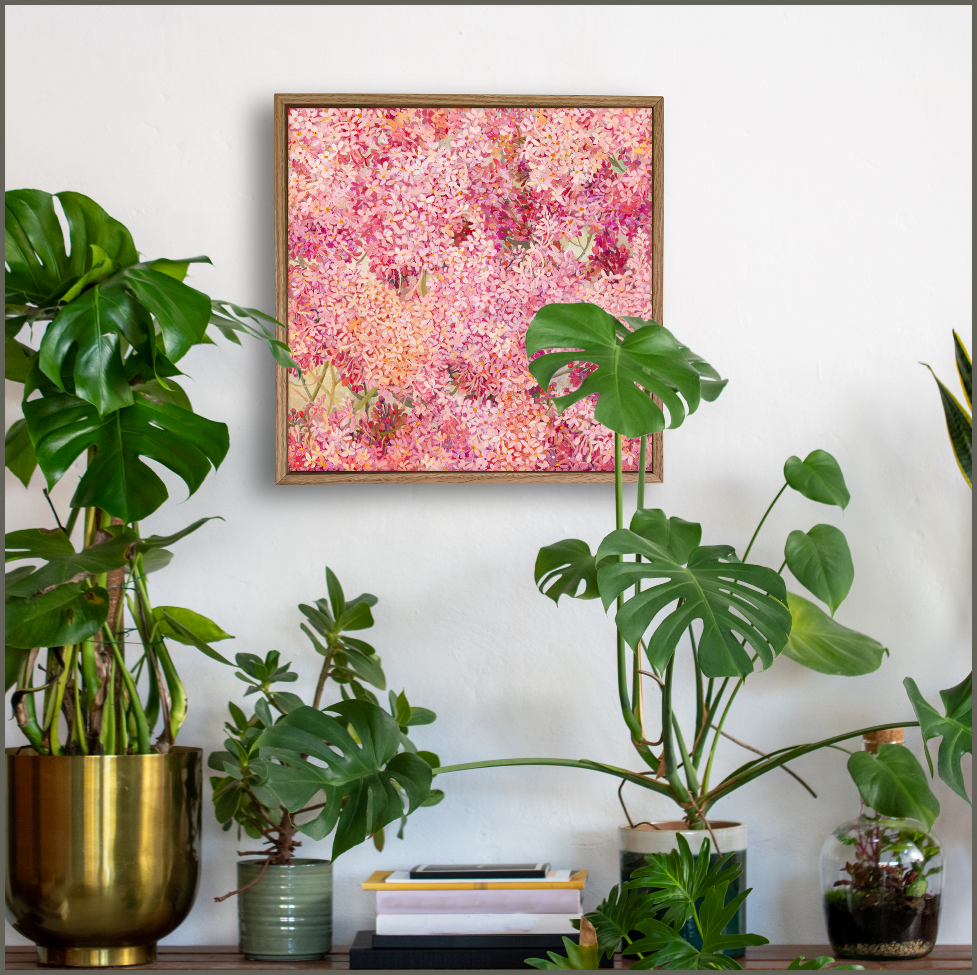 様々なピンク色が重なり合う優しい色合いが特徴です。奥行きをじっと見ていると吸い込まれていくような幻想的な表現を追求し、心が静まり前向きな気持ちになれるよう光を描き込みました。