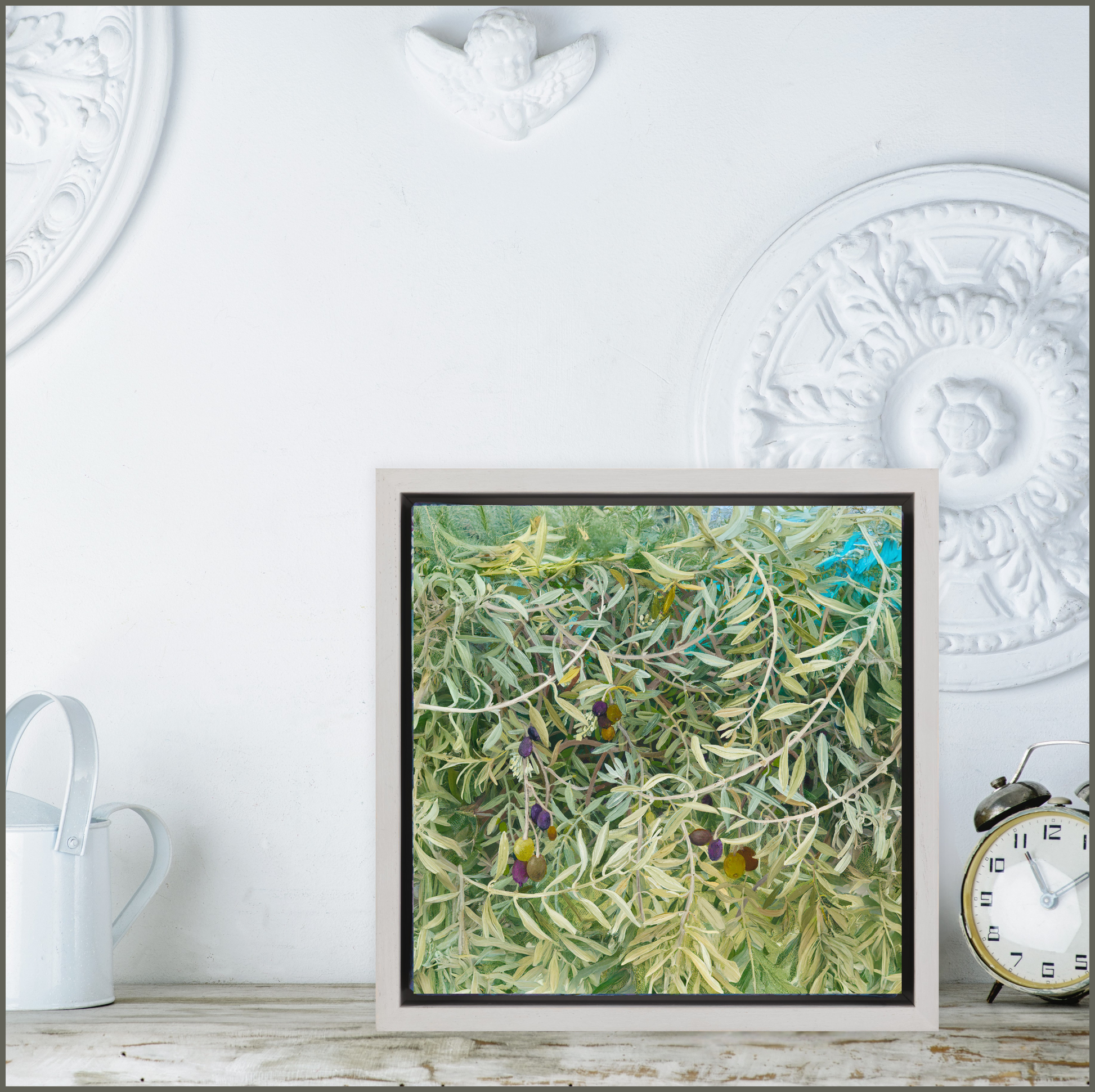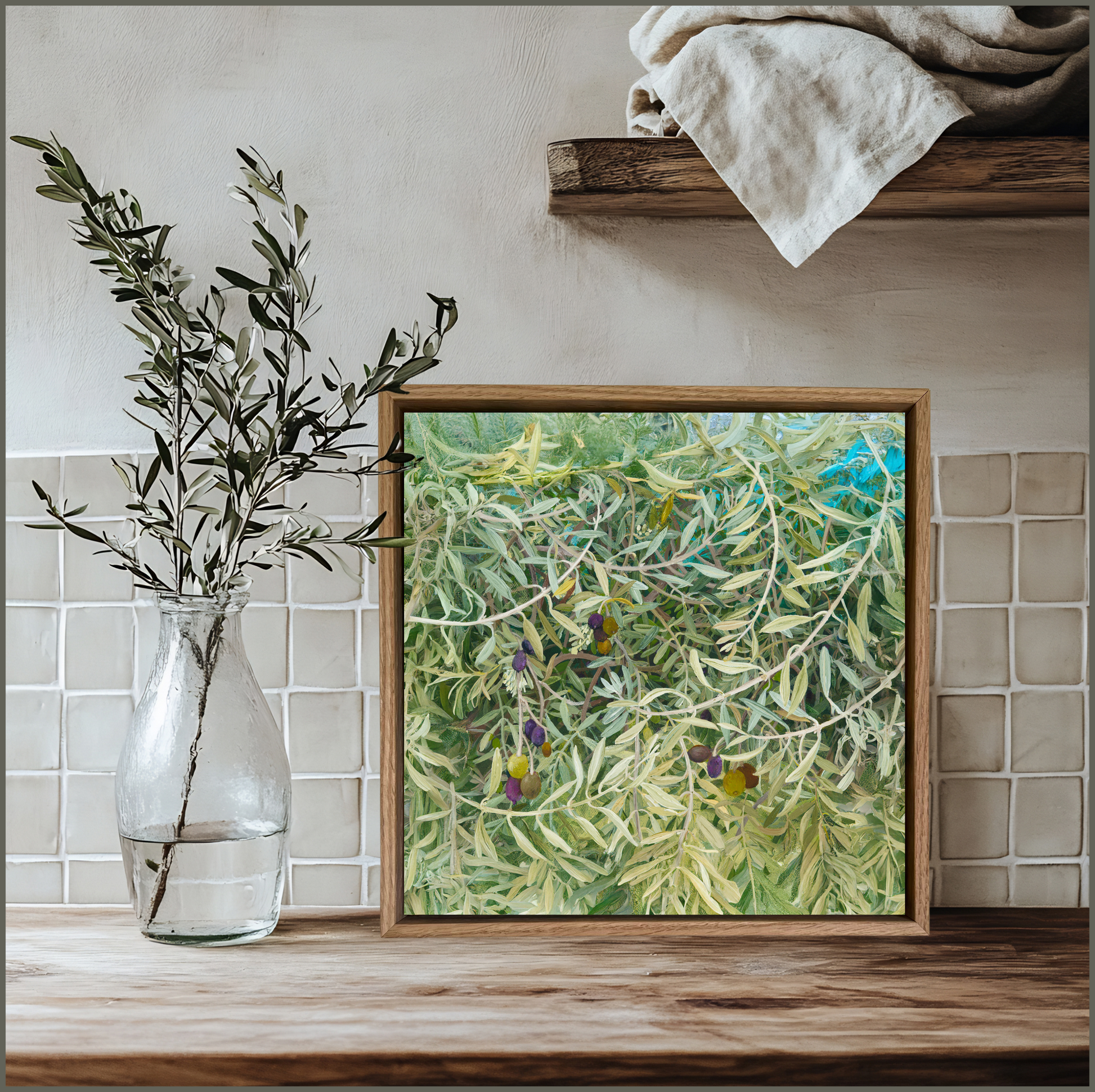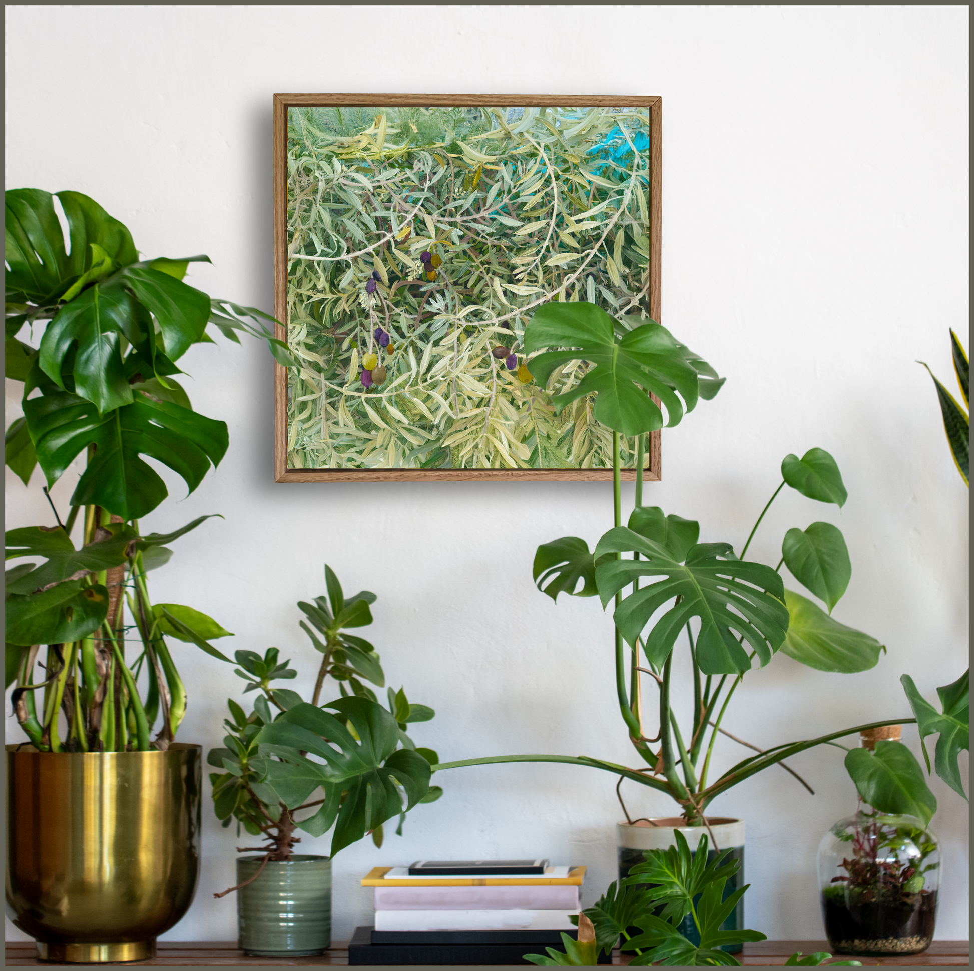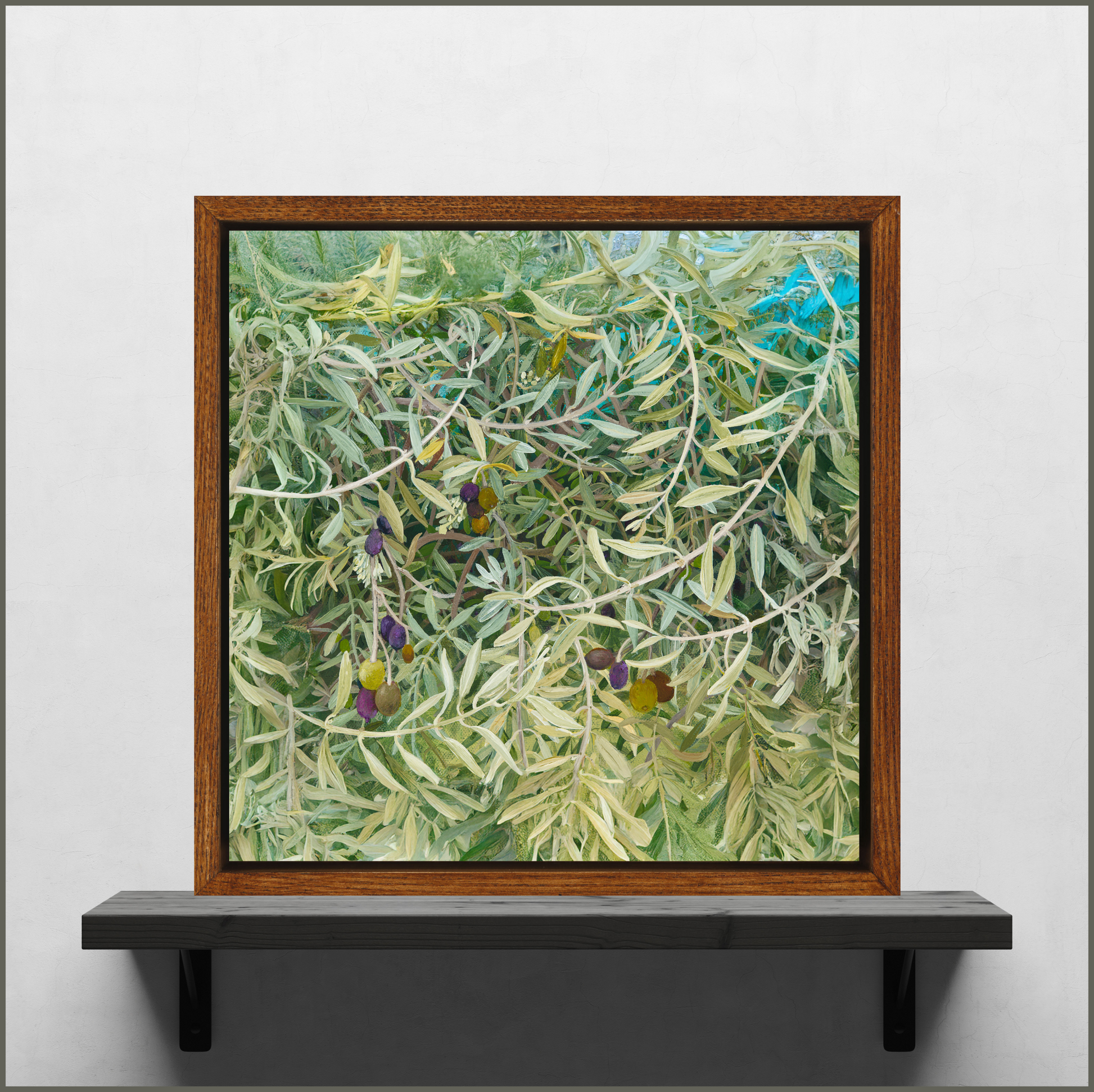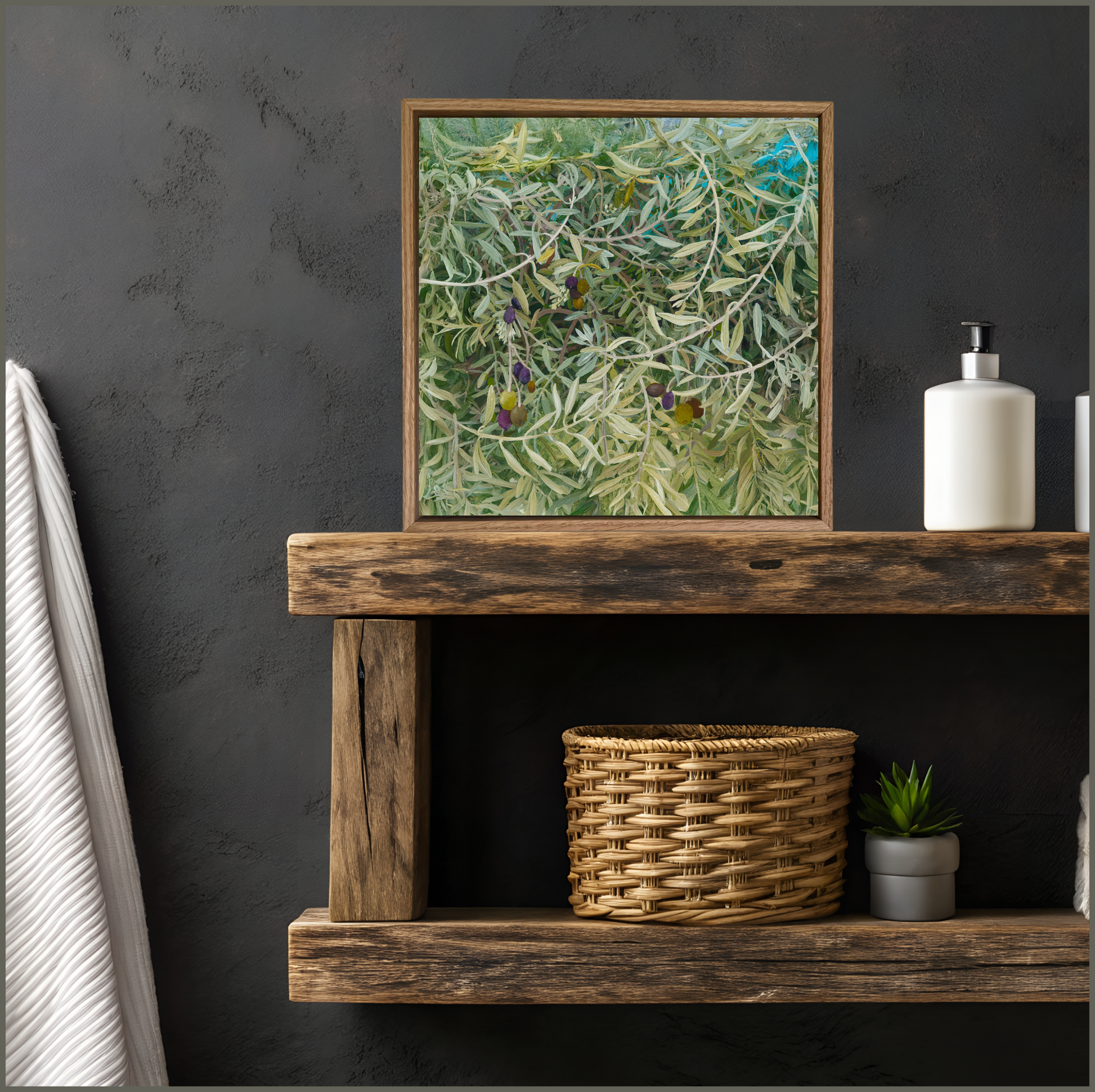 作品の深い奥行きは、原画をご覧になった方々が驚かれる点です。一枚一枚の葉を丹念に描き込むことで、見る人を引き込む世界を創り出しています。オリーブの緑色と、紫や緑の実が、穏やかで落ち着いた雰囲気をもたらします。