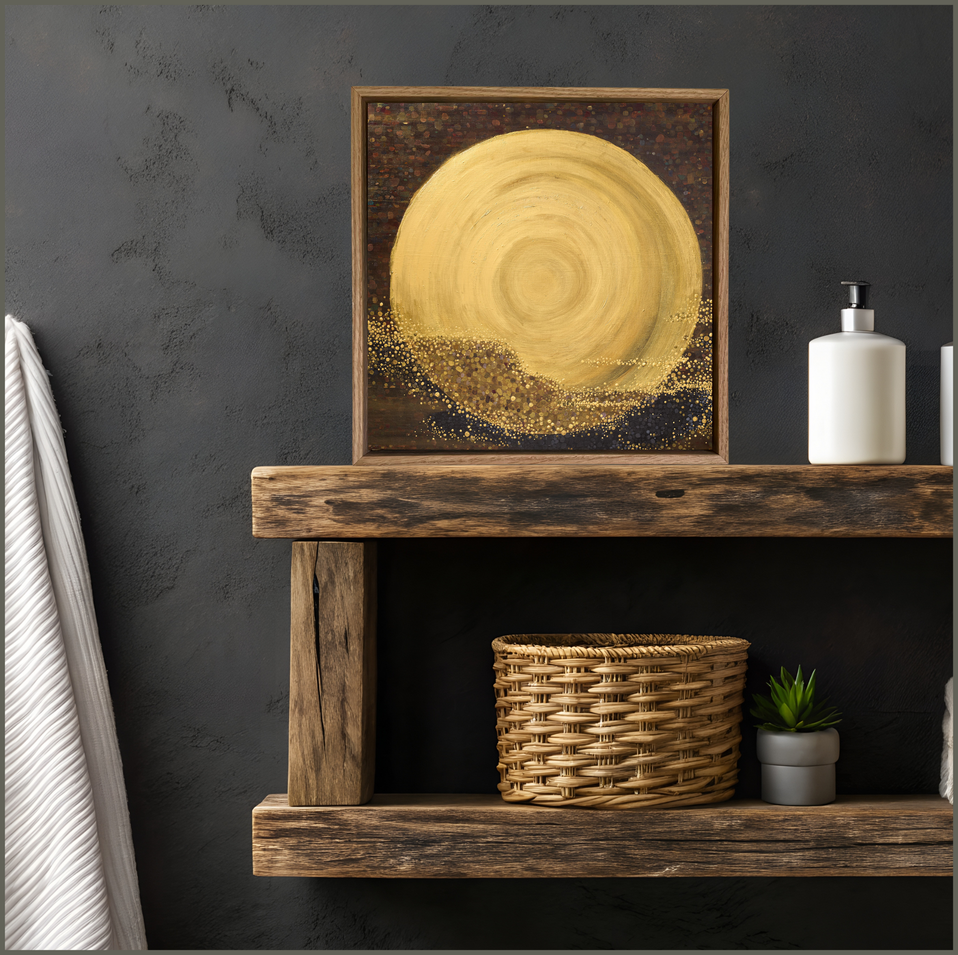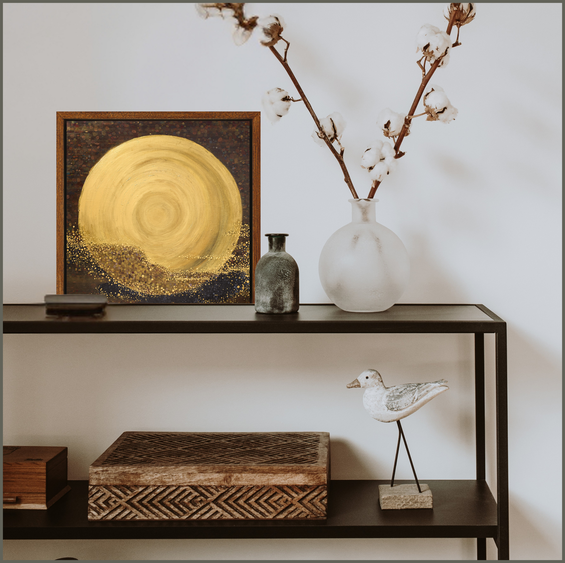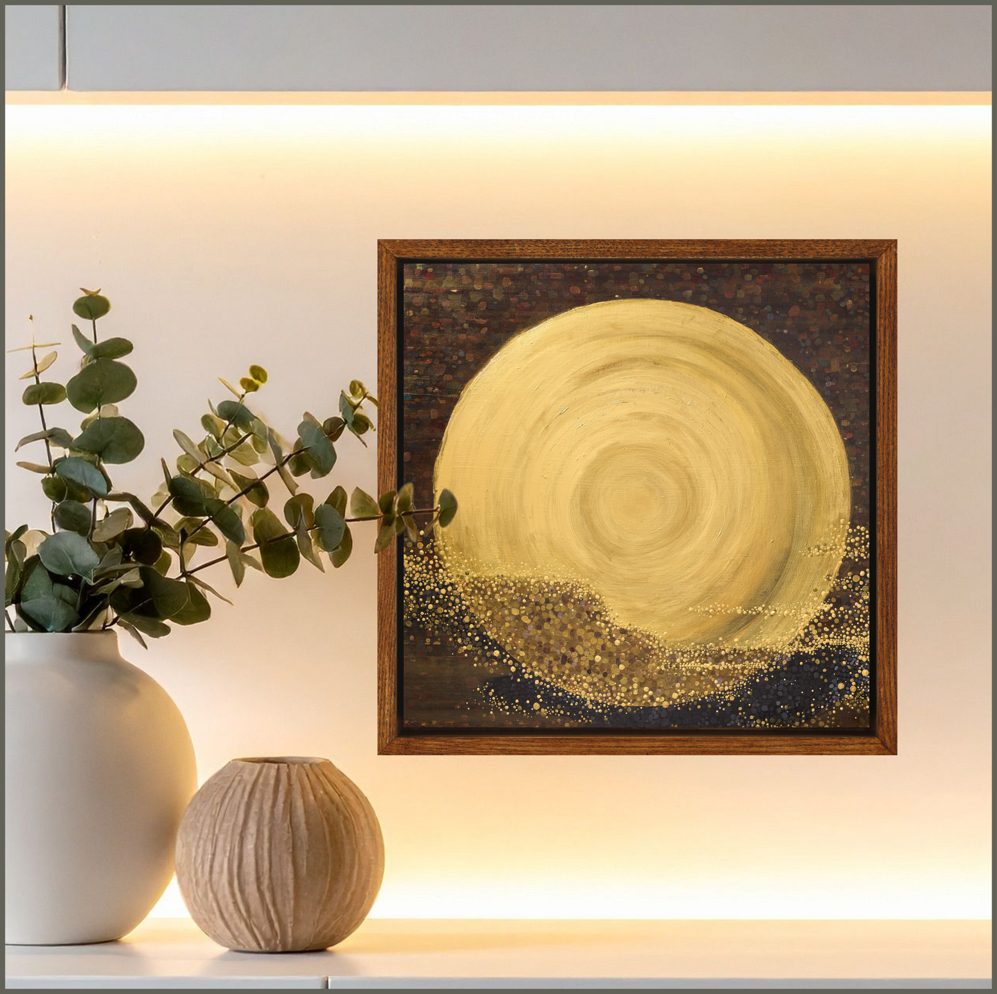 静かに輝く月と黄金の雲の光が描かれたこの作品には、「あなたらしく輝けばいい」というメッセージが込められています。見ているだけで心と体の疲れが溶け、温かい煌めきに包まれるでしょう。