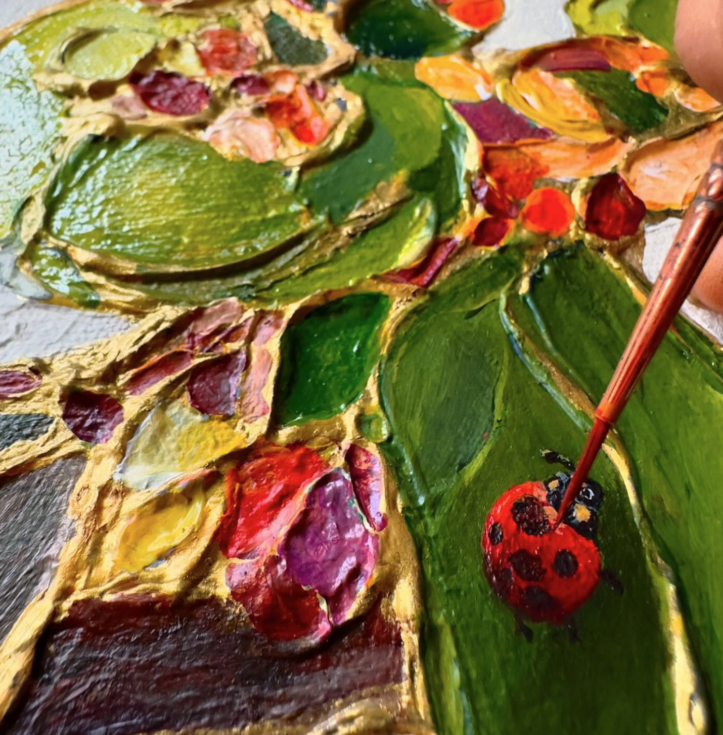 This piece was commissioned by a dear friend in Japan. The lime tree blossoms and bears abundant fruit. The gold, made with gold powder and leaf, changes its expression with the angle of light, captivating the viewer’s heart. The ladybug, a symbol of good luck, adds an extra sense of excitement and joy. This piece, reminiscent of stained glass, beautifully expresses the wonder of life.