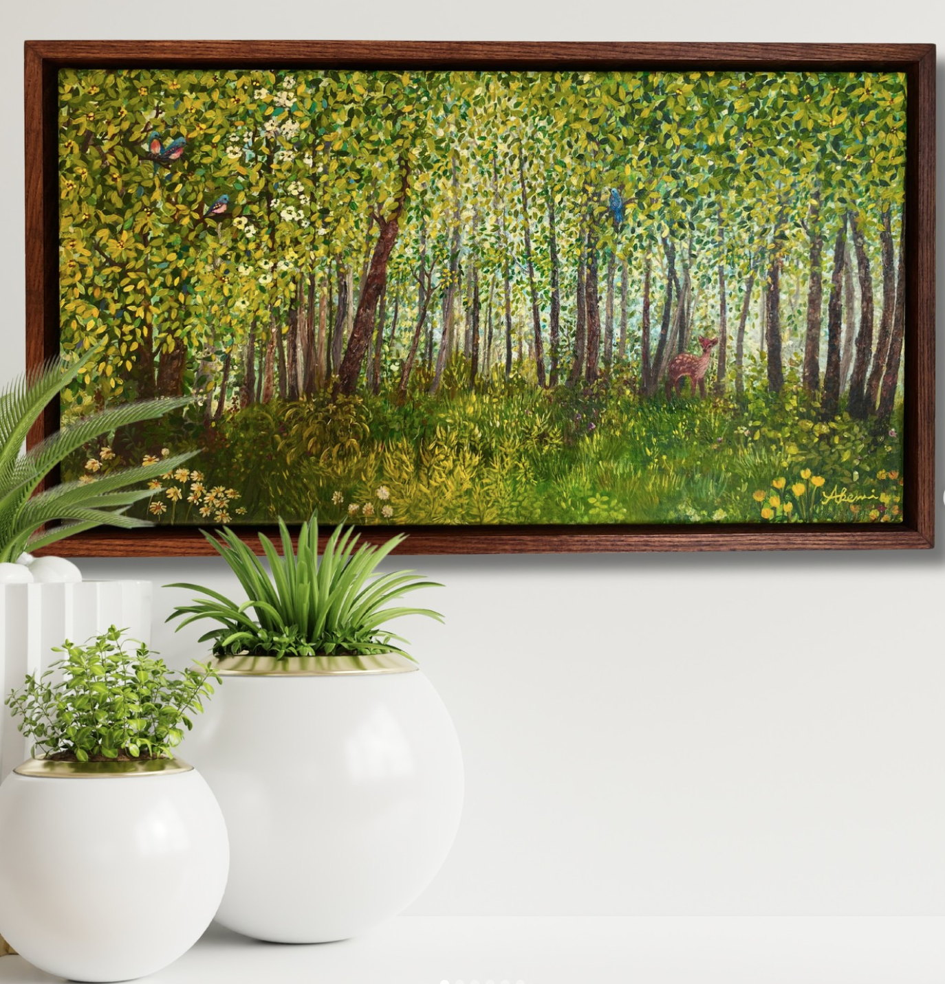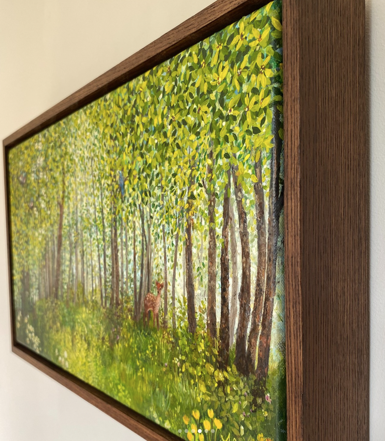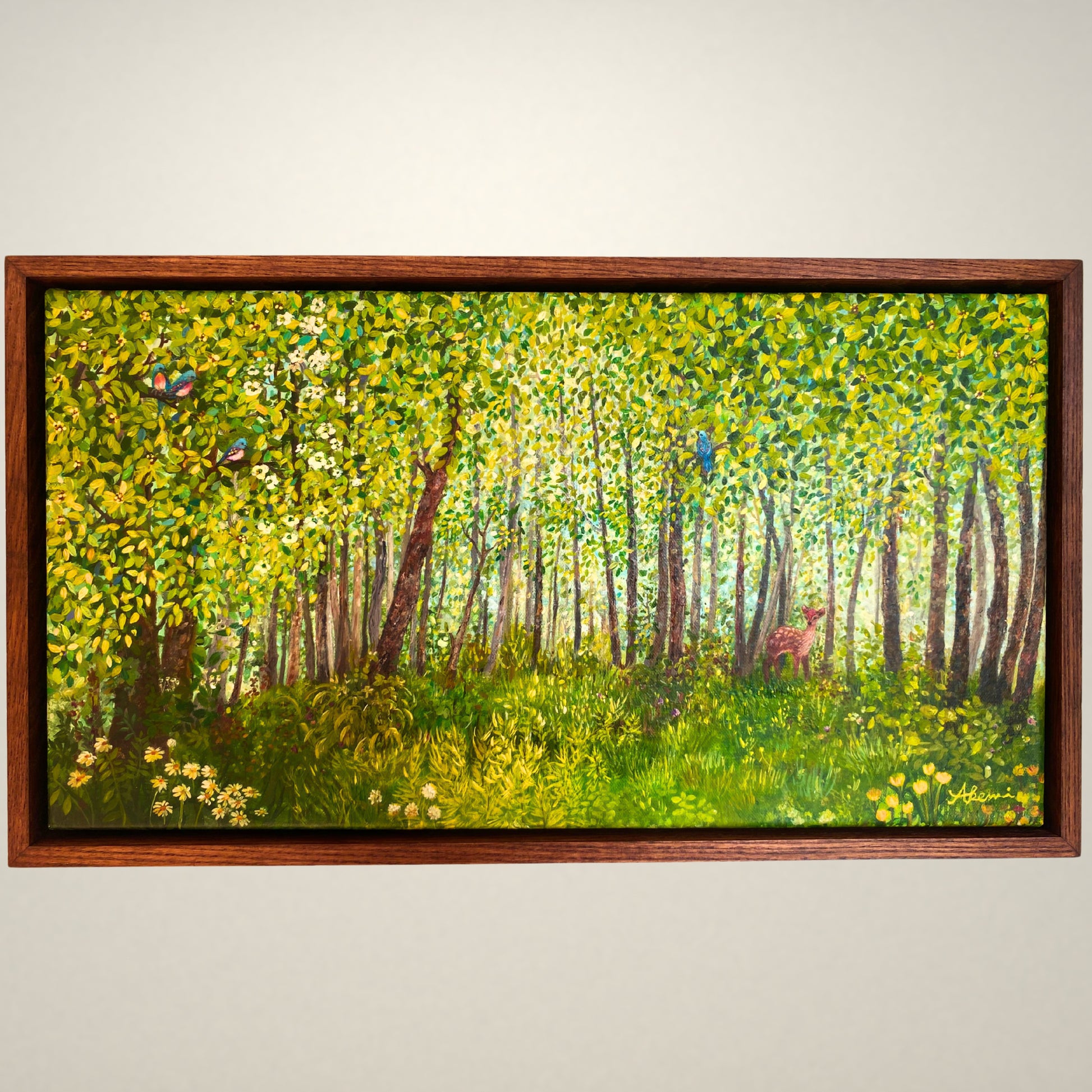 Size: 28 x 50cm. Mixed media on linen canvas with UV varnish. Framed in dark brown oak.